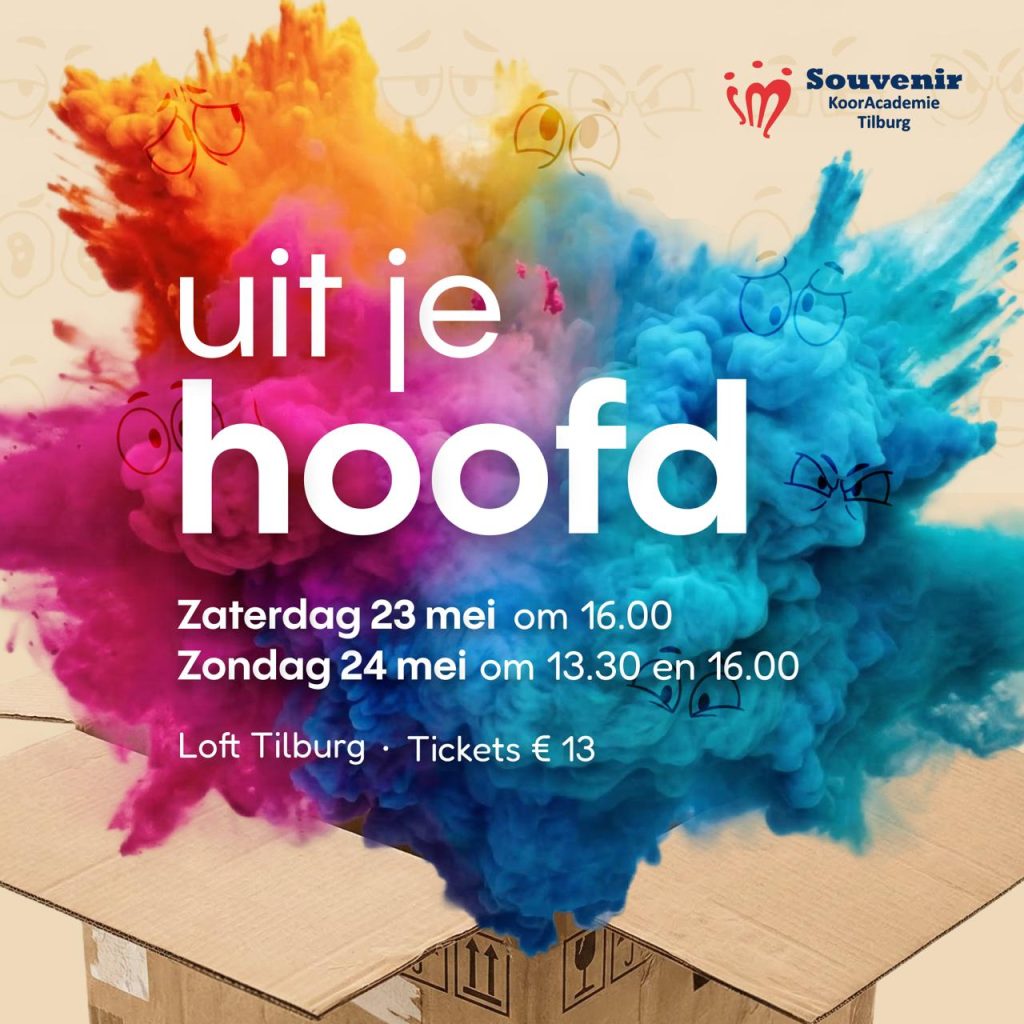 Souvenir KoorAcademie Tilburg brengt op 23 en 24 mei 2026 met 62 zangers hun muziektheatervoorstelling ‘Uit je Hoofd’ op het toneel. De voorstelling is geïnspireerd op de film van Pixar ‘BinnensteBuiten’, afgewisseld met prachtige, swingende, ontroerende liederen onder begeleiding van orkest.